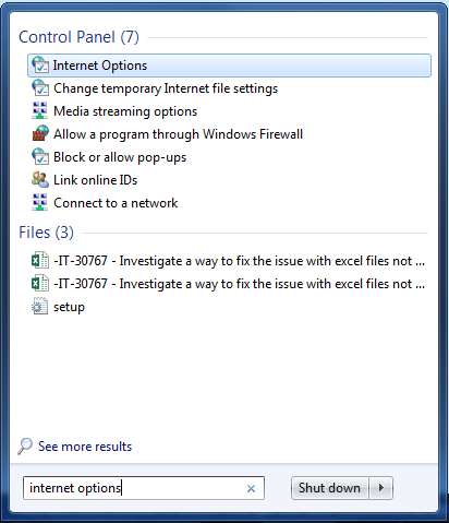 2) Search for Internet Options and select it. It should be under a heading that says Control Panel